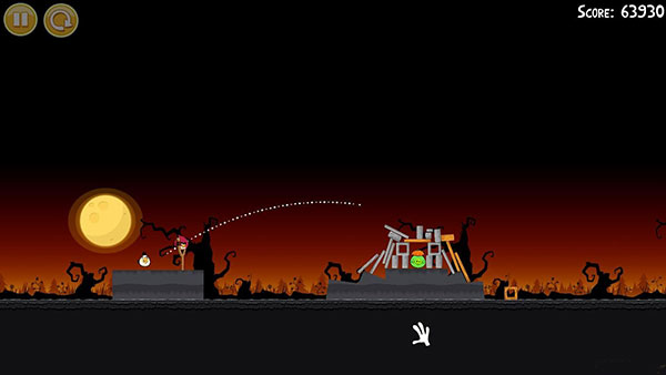 1-17:第一个炸弹按照图中轨迹首先摧毁建筑结构和南瓜(一定几率一鸟全灭),第二加速鸟非常重要,需要准确击中右边的木条,让右边的建筑往左边倒!