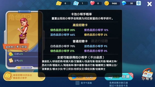 员工可大幅减少玩家的工作量。招聘的方式分为两种,分别是钻石招聘和普通招聘,详细的抽卡概率如下: