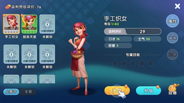 在主线任务里,若想要丰富家园内容则需要通过谈判来改变土地使用性质。这时候就需要用到谈判技巧,通过升星提升小帮手的等级,增加谈判的成功率。