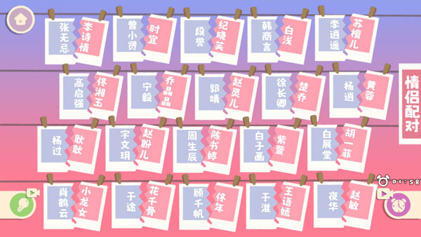 这个关卡就是将大家熟悉的情侣放到一起进行配对,如郭靖和黄蓉、杨过和小龙女等,全部配对成功即可通关。