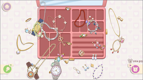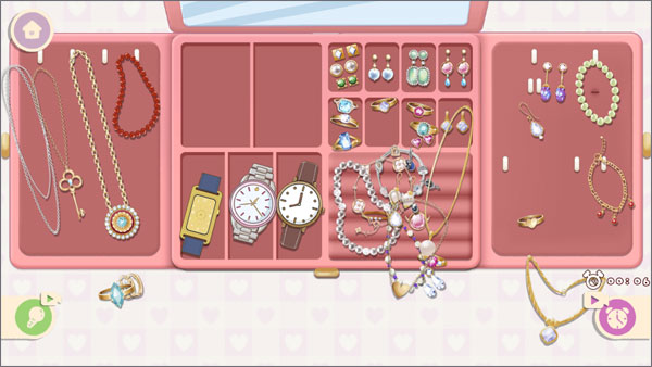 首饰盒包含耳坠、项链、手表等,根据东西的不同大小、形状来放到指定的位置上。