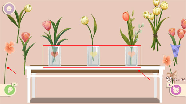 这一关就是根据瓶子上爱心的颜色来插入到对应的位置上,像浅粉色的花放到最右边的瓶子,黄色的放中间,深粉色放最左边。全部放好后就表示收纳成功了。
