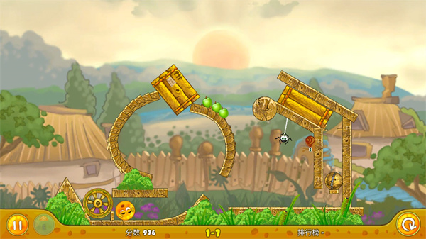 第七关:首先用轮子把坐下面的炸弹炸掉,让橙子滚下来,然后在使用一个轮子挡在橙子旁边,最后用箱子封住上面的口子。