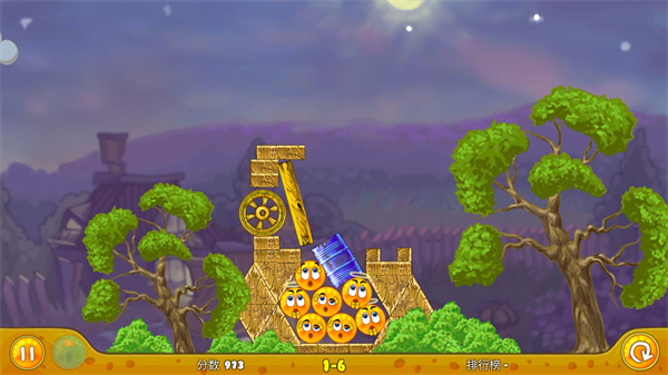 第六关:先用一个汽油桶把炸弹炸了,然后用轮子吧最上面的橙子滚下去,最后用汽油桶压在橙子上面就可以啦!