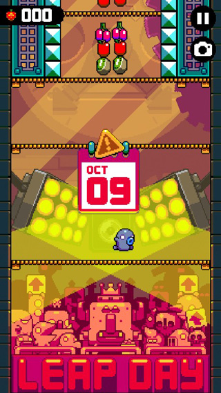 天天飞跃(Leap Day)是一款基于飞行题材的闯关类的休闲益智手机游戏。《天天飞跃》用了另类的算法每天自动生成一个新的关卡,让你总能找到新的闯关乐趣。每个关卡都由 16 个小场景组成,每个场景有一个存档点,可以通过收集的水果或观看广告解锁(你也可以通过内购永久解锁所有存档点)。随着你上升的层数增加,你的评价也会从铜奖到金奖不断变高,而如果你一路上吃掉了所有水果,还能赢得最高荣誉——An APPle Award!除此之外,天天飞跃设计有涵盖从原始丛林到未来世界、从冰天雪地到酷热荒漠的数十个不同场景,而每个场景都有着各自的特殊元素,例如密林中喜欢吐舌头的食人花、太空站里的致命激光、极地中倒悬的冰棱及沙漠里会动的仙人掌。随着游戏的深入,你还会发现更多有趣的元素,比如被激怒后露出锋利骨刺的剑齿龙、会跟着你跳跃的小蘑菇、能穿墙而过还成群结队的鬼魂、动一下就换一个表情的呆萌图腾…总之,Leap Day 每天都会带给你不一样的惊喜。