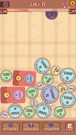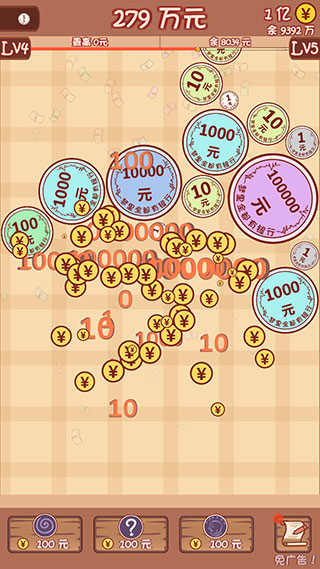 2、当两个相同的硬币接触碰撞时就会合成出更大的面额的硬币,并会增加你的硬币余额。
