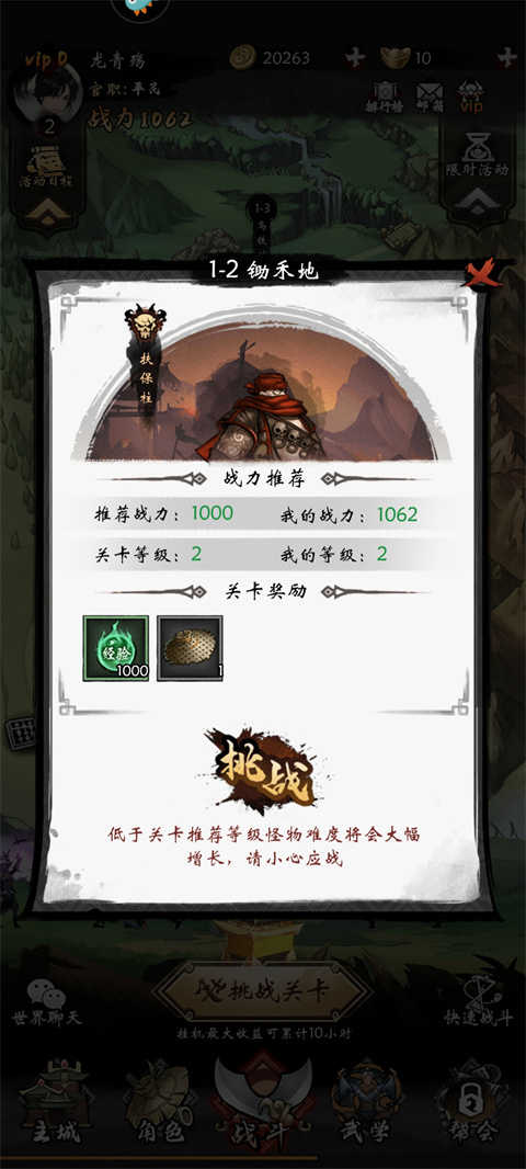 1、首先是挑战关卡或者挂机,每次提升等级可以获得元宝