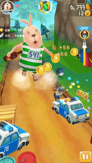 逃亡兔官方正版是一款由日本动画短片《越狱兔》改编的跑酷闯关游戏,得到了动画的正版授权,游戏延续了动画的幽默搞怪基调,并且高度还原了动画中的人气角色,玩家可以在游戏里看到动画中的各种经典角色出现。