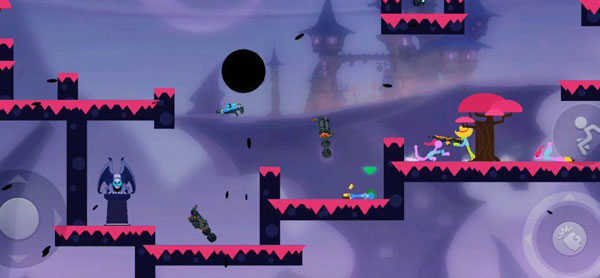 在场景中,火柴人通过使用掉落的武器和地形的变换与其他玩家战斗并击败其他玩家获胜