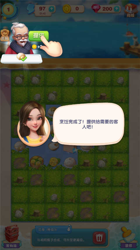 1.完成订单,可获得“水滴”棋子,可以直接双击收集,也可合至更高等级后收集,收获更多“水滴”。