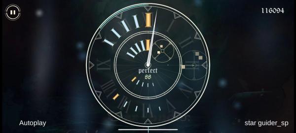 游戏整体的玩法是两个同心表盘,一大一小,note以表盘上数字的形式出现,两指针从表心出发,分别在内外两表盘内逆时针转动(两指针不一定以同样的速度转)。扫过note时点击,也有flick之类的。操作的时候不用点到表盘上,在屏幕内就可以,双押的话也是两只手指同时就可以,不考虑位置,操作还是比较简单的,容易上手