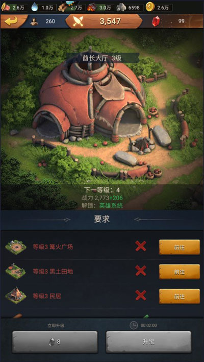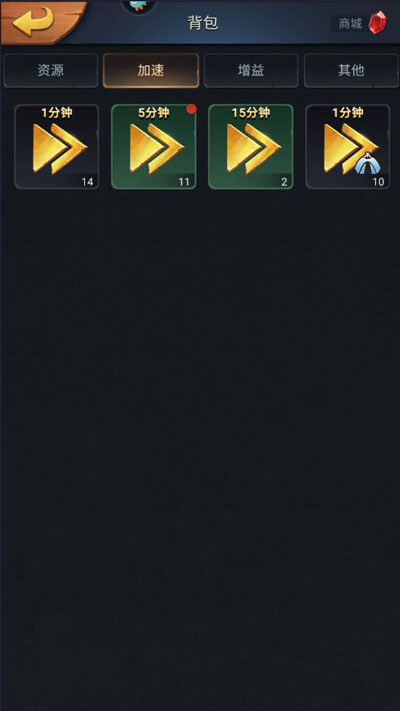 6、每次建造或者升级建筑都需要时间,你可以使用加速卡或者宝石来建造或升级