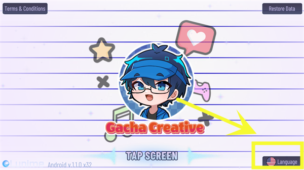 1、在本站下载并安装加查创意(Gacha Creative),进入游戏后可以看到游戏默认为英文,需要点击右下角按钮,如下图所示