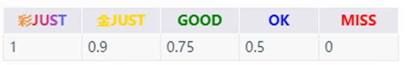游戏对音符的判定共有5种,分别为彩JUST,金JUST,GOOD,OK与MISS。打出Miss时Combo会中断。五种判定的对应误差区间如下所示
