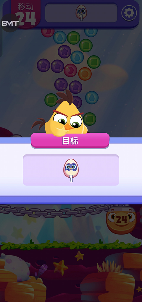 2、上方有数量颜色的泡泡是玩家需要完成的任务。并且在下方的小鸟为强力的道具;