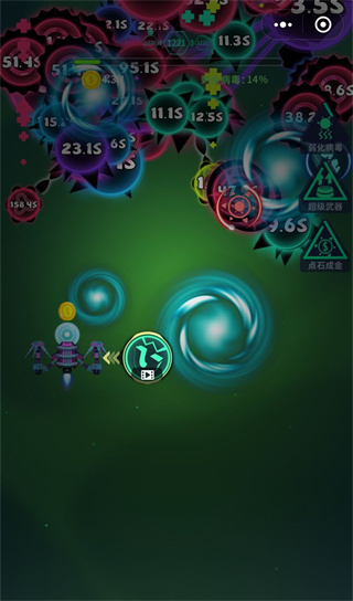 这一个副武器的功能就是在几秒的时间内发射一个泡泡,当把范围升级到满级之后(32级),会发射出一个巨大的泡泡,大家试过满级体验之后可能都觉得很厉害,这么大的一个泡泡不就无敌了么,但其实并不是这样的,这个泡泡无论范围等级有多高,他还是改变不了它的弊端,那就是他碰的次数,当他碰到病毒第三次的时候他会爆掉,这三次的攻击,打的伤害可谓微乎其微(本人试过满级体验,就算999火力打一下也只能让病毒分裂),本人觉得挺坑的,所以这个不推荐大家使用。