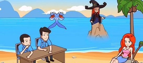 2、然后会出现女巫,点击女巫手里的瓶子,拖到海里的鱼上。