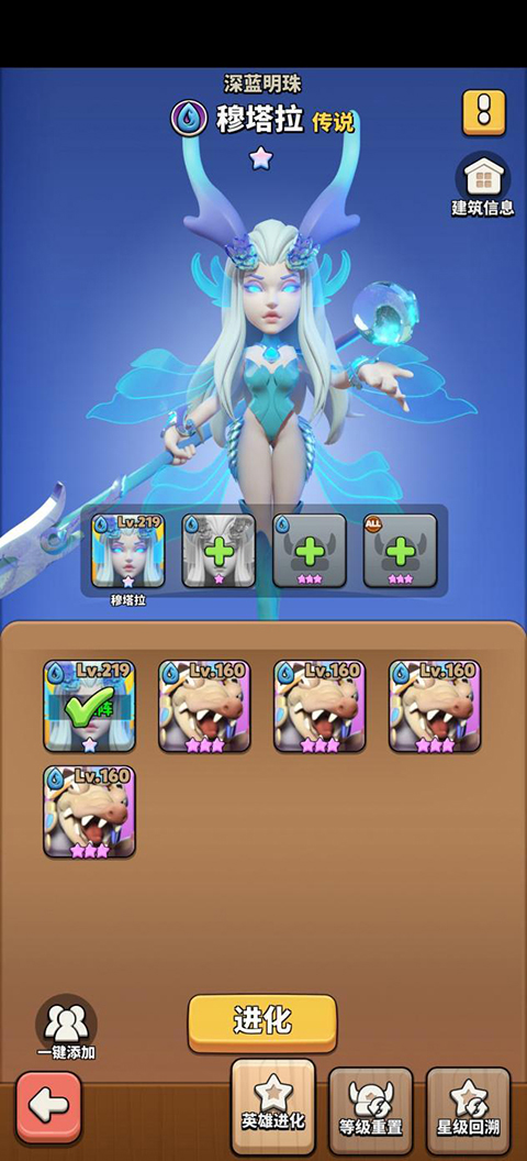 在此处建筑中,可以对英雄卡牌进行进化升级,以此来提升他们的星级、等级和战斗力。提升星级需要有两个相同星级的英雄进行合成,而提升等级和战斗力,则需要玩家收集突破对应等级索需要的材料来进行。