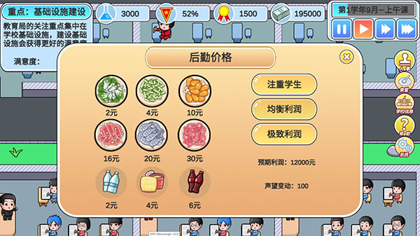 金钱表示学校的可用资金,可以用于维持教师工资,建造建筑物等用途,可以通过食堂和小卖部销售来招收择校生来获得。