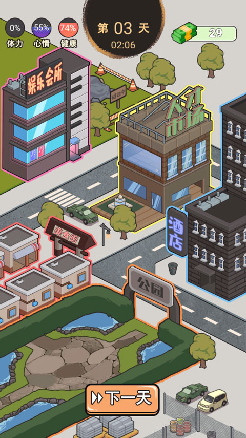 这是你的世界手机版游戏以“挑战15块钱生活一个星期”为主线任务,玩家需要在有限的资金和资源下生存并发展,不断克服各种困难和挑战,游戏中真实还原了体力、健康、情绪等基本生活状态,让玩家在经营模拟的过程中能够深刻体会到生活的酸甜苦辣。