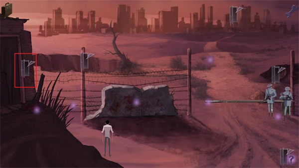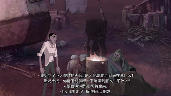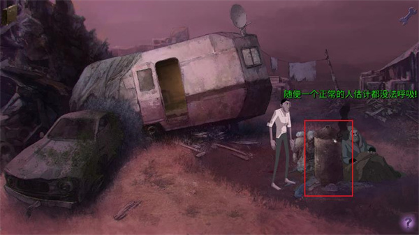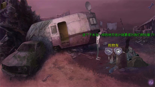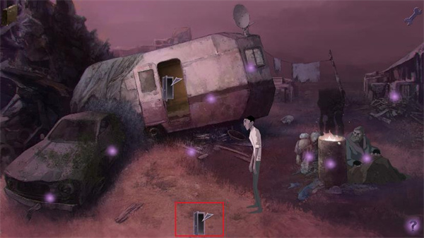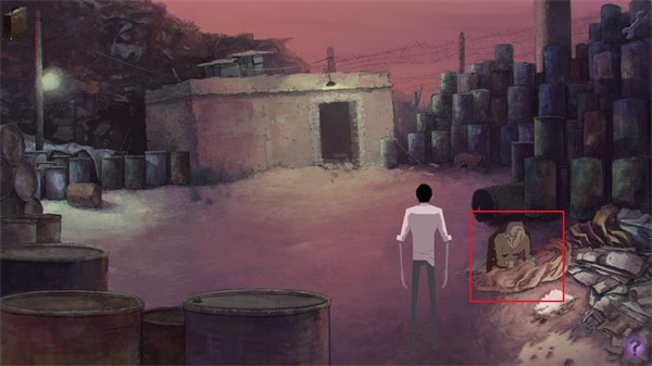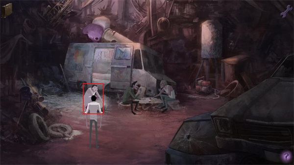 4、通过右侧的门离开房间。到了外面才发现,刚才是处于一辆车的车厢中。我们先和火炉右边无家可归的流浪汉聊天,主人公刚醒来,再加上失忆问题很多。