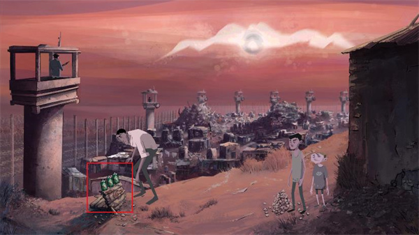 14、将刚才从酒吧得到的啤酒罐给孩子,记住是给孩子。然后又是对话,随着对话的剧情,主人公将啤酒罐放在木头上,供孩子们投掷。