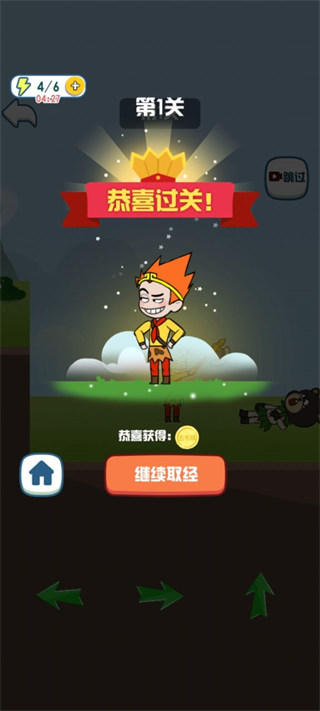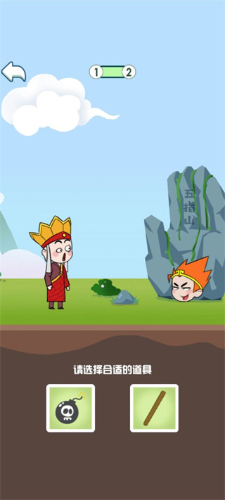 游戏还把脑筋急转弯的元素融入游戏当中,不如刚刚遇到孙悟空需要解救他时,游戏下方会出现两个选择,是选择用炸药还是用撬棍来帮助孙悟空跳脱五指山,玩家需要选择正确的一个才可以通过,否则就失败啦!