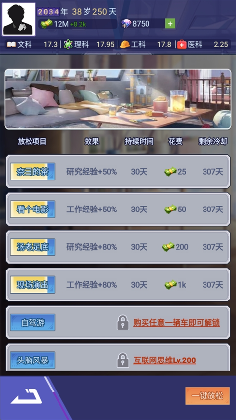 玩家可以消费不同的费用进行放松,同时增加自身的属性。(放松项目需要冷却时间)