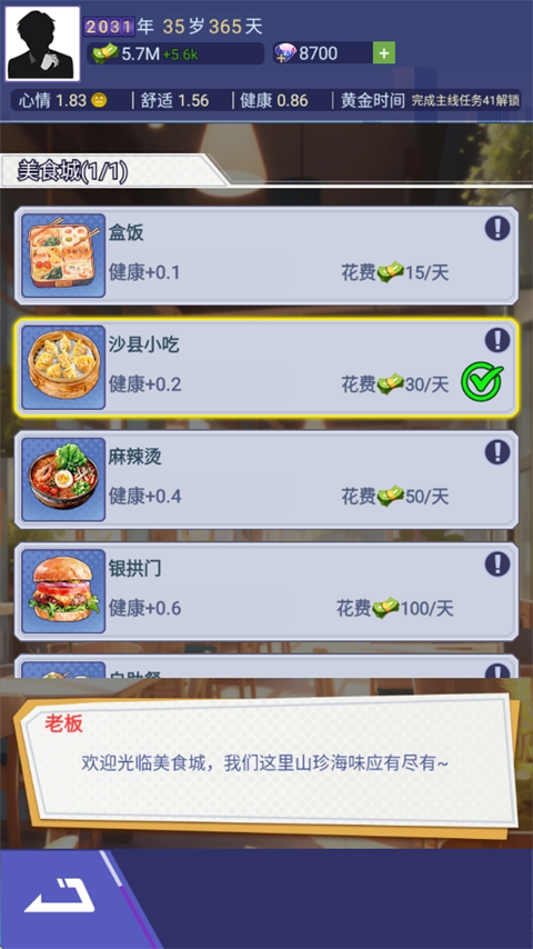 每天为玩家提供不同的食物,玩家可以根据自己的收入来进行选择。食物花费越高获得的健康值越多。