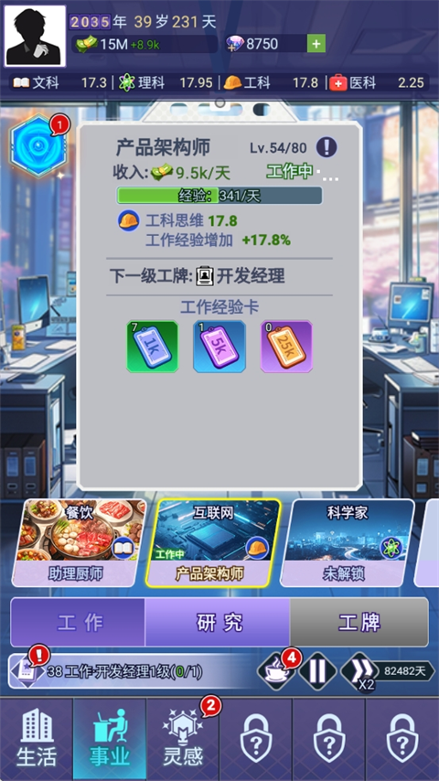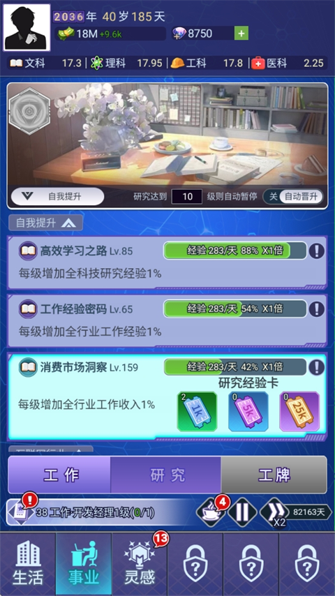 玩家可以学习不同的技能,每一种职业技能都会增加不同的工作属性,等级越高加成越多。(技能可以使用研究经验卡进行快速提升)