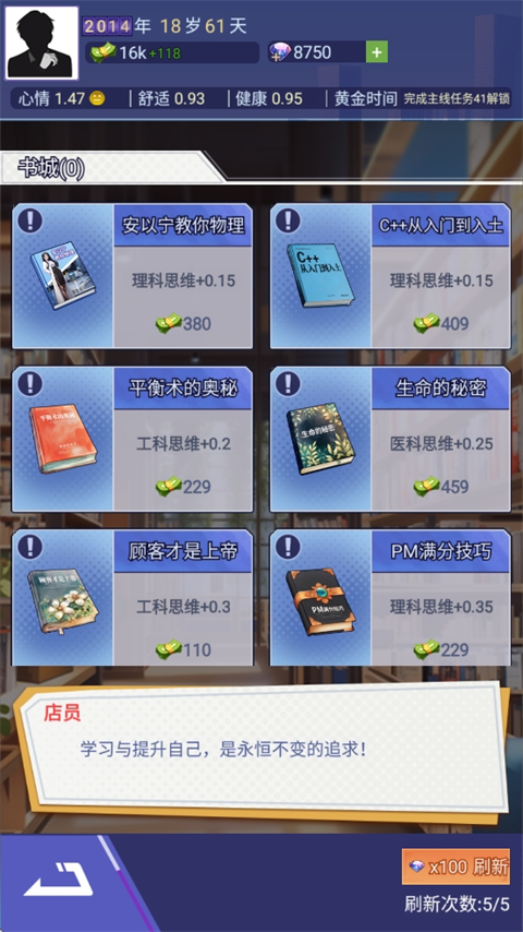 可以购买不同行业的书籍,玩家每次购买书籍会增加对应的思维能力。