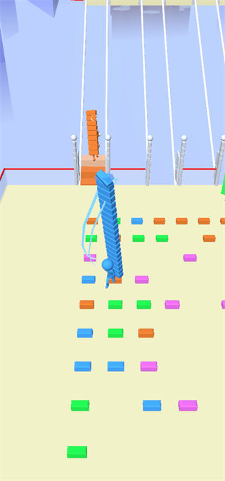 搬砖争霸赛游戏中玩家将变身成搬砖达人,这里有多个不同颜色的砖块,玩家需要搬指定颜色的砖块,然后一层一层的往上塔,直到爬到最上一层,前期一共有三层,每当我们爬上一层都会有砖块要搬,不过只要是第一个上去的话,就只有我们这一种颜色,所以最重要的就是搬砖的速度要快。