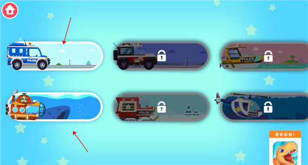 恐龙警车最新版是一款趣味性十足非常适合小朋友游玩的儿童益智类游戏,游戏采用的是动感卡通风格的画风,其地图画面充满了鲜艳的色彩,地下铁路、雪山、海洋、海底等孩子们喜欢的场景如画卷般呈现在孩子们的眼前,而且还有超多如迅猛龙、开角龙等非常可爱的恐龙角色们,搭配上趣味的玩法,能够带给小朋友们精彩的游戏体验。在恐龙警车当中孩子将会扮演恐龙警察,操控驾驶着山地警车,雪地摩托,潜水艇,巡逻艇等设备去追击银行抢劫犯,可以在追逐的同时收集物资包、海底的珍珠,沿路的金币等等,享受收集和追捕的乐趣,同时地图内还有喷墨的章鱼、发电的电鳗会和孩子们展开热情的互动,让孩子在游戏世界当中享受充满冒险与惊喜的欢乐旅程。