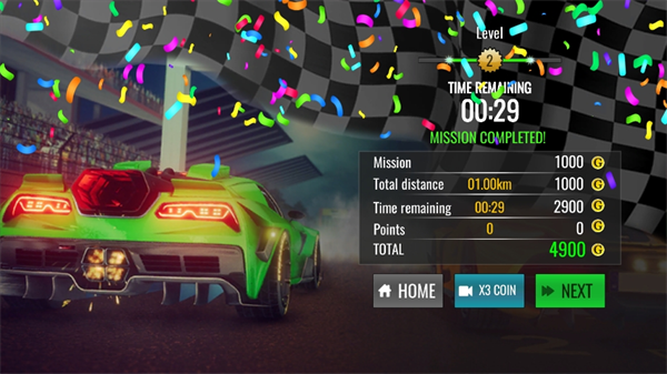 3、在穿越关卡的过程中,玩家还需要注意避开其他车辆,到达终点完成比赛,还可以获得丰富的金币奖励,使用金币可以解锁更多的新车。