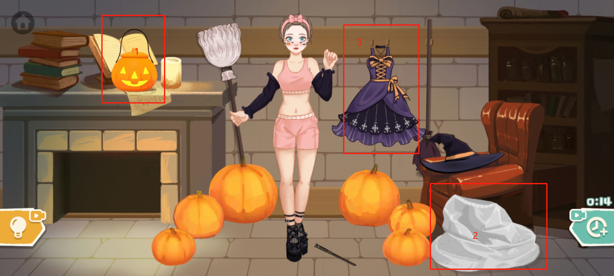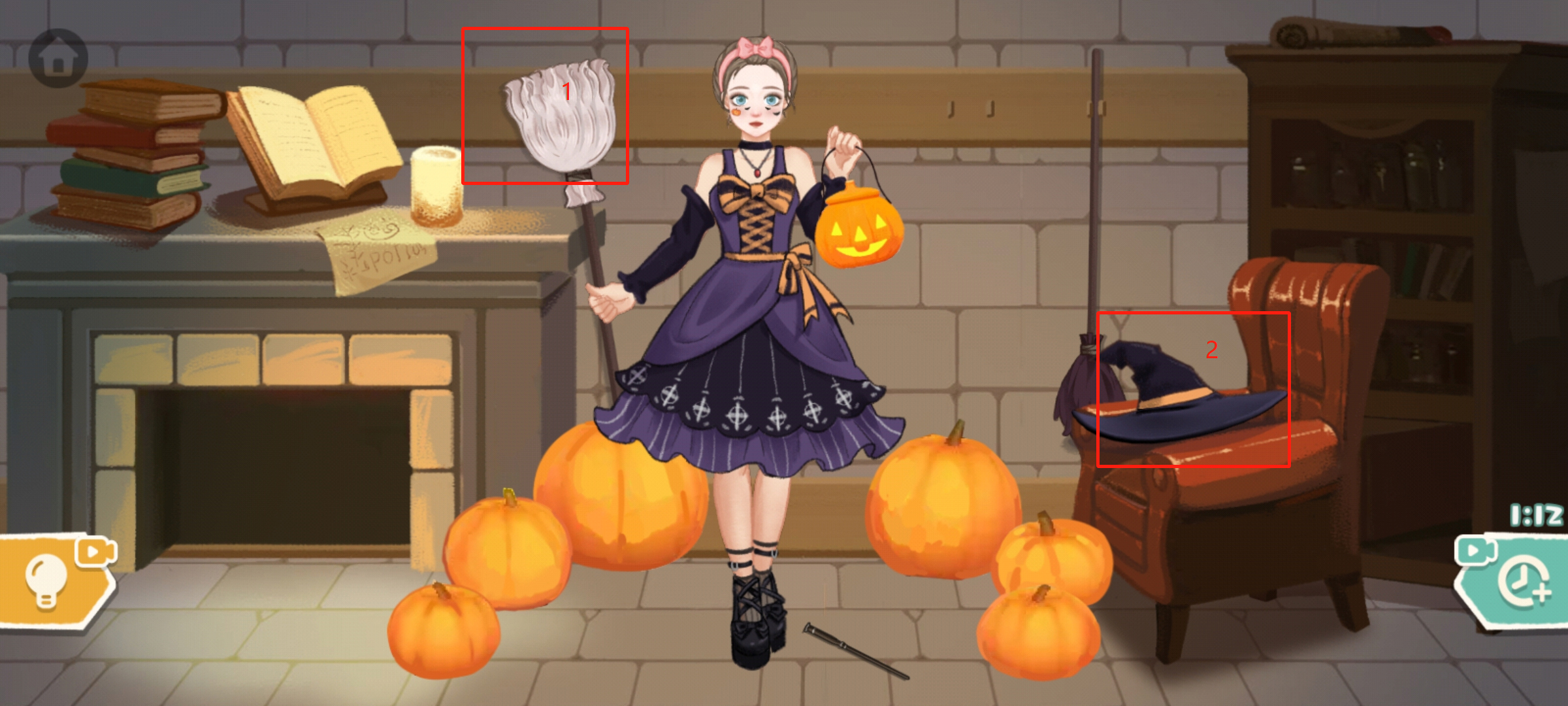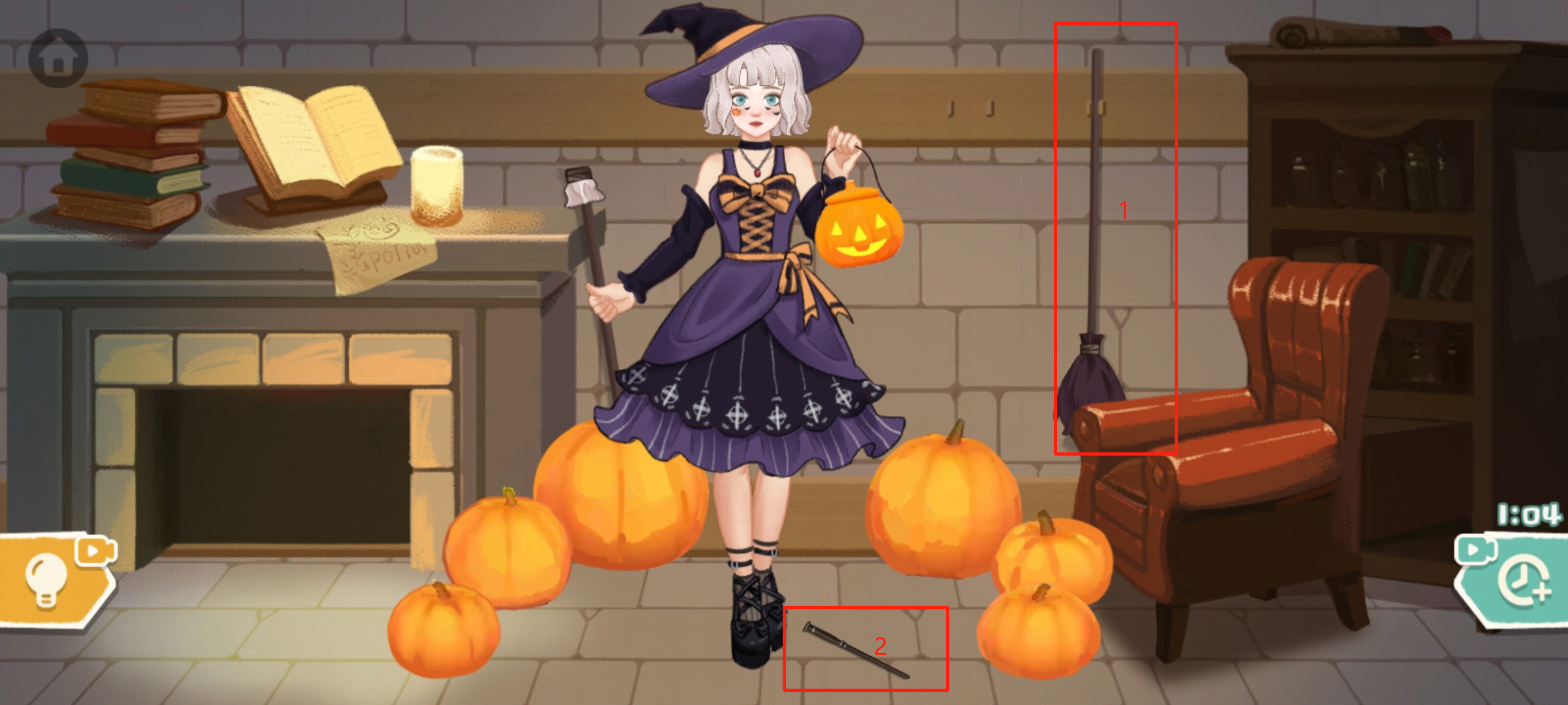 9、最后把扫帚放到小姐姐的右手,用小刀把周围的南瓜雕成南瓜灯,即可成功通关