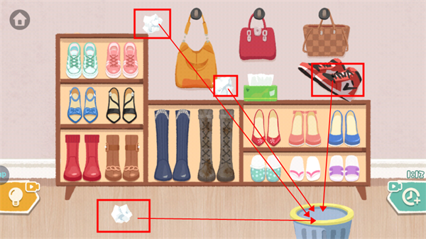 4、最红还剩下一双红色运动鞋,扔到垃圾桶;各种垃圾纸团扔掉,最后用纸巾擦干净靴子,即可通关成功