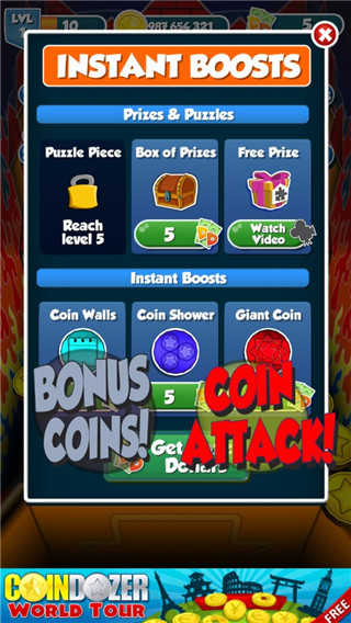 金币推土机手机版是一款玩起来休闲趣味的游戏,游戏采用卡通的风格画面,画风精致,游戏操作方式简单,在这里玩家可以通过投掷金币来进行闯关,在这里还原了游戏厅里面的机器,可以不断地使用金币来推动机器,不断地赚取更多的金币,但是很是考验玩家的操作性,需要调整角度向推币机里投硬币,看看是否能把游戏币给推出来,玩起来很是有趣。同时金币推土机作为街机店里赌币常用的机器,推币机效果很真实,起始时有50个币,赌一把自己的运气,努力将金币积攒的越来越多。游戏中每30秒系统会自动送一个币,下线时,每小时可以得5个币。所以玩家可以隔几天再玩就有新的币了。除此之外,玩家在游戏的过程中会随机掉下礼物,收集它们可以提升特殊效果,例如金币墙持续的时间更久等,不同的道具的功能都不一样,玩家可以尽力多推一点。喜欢的玩家还在等什么,不妨下载体验一下试试看吧!