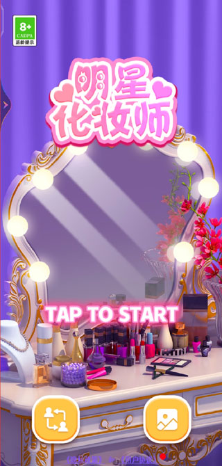 1、首先打开明星化妆师游戏,左边方块可以选择将要化妆改造的人物,右边方块是相册,化完妆以后拍的照片会在这里显示,点击“TAP TO START”开始。
