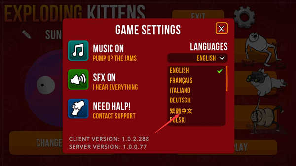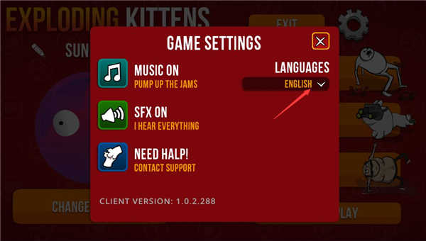 1、下载安装好爆炸猫桌游app,打开进入游戏我们界面是英文的,点击右上角的设置;