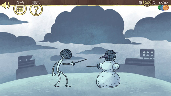 第二十关:这关非常的内涵,我们看到是人物和雪人击剑,那么我们只需要把太阳给露出来就行了;首先长按中间的云朵,然后向右移动,然后再点击人物,雪人就会融化,那么就会赢了;