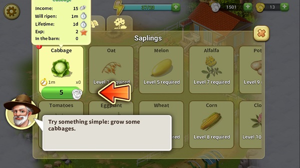3、关于种植:当用于种植的土地为空时,点击土地,进入作物选择界面。