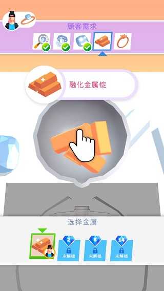 5、抛光完成后,开始浇筑,点击屏幕,融合金属锭,接着倒入模具中,完成。