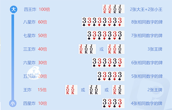 4张及以上相同点数的牌为炸弹,2张及以上的王牌也视为炸弹。