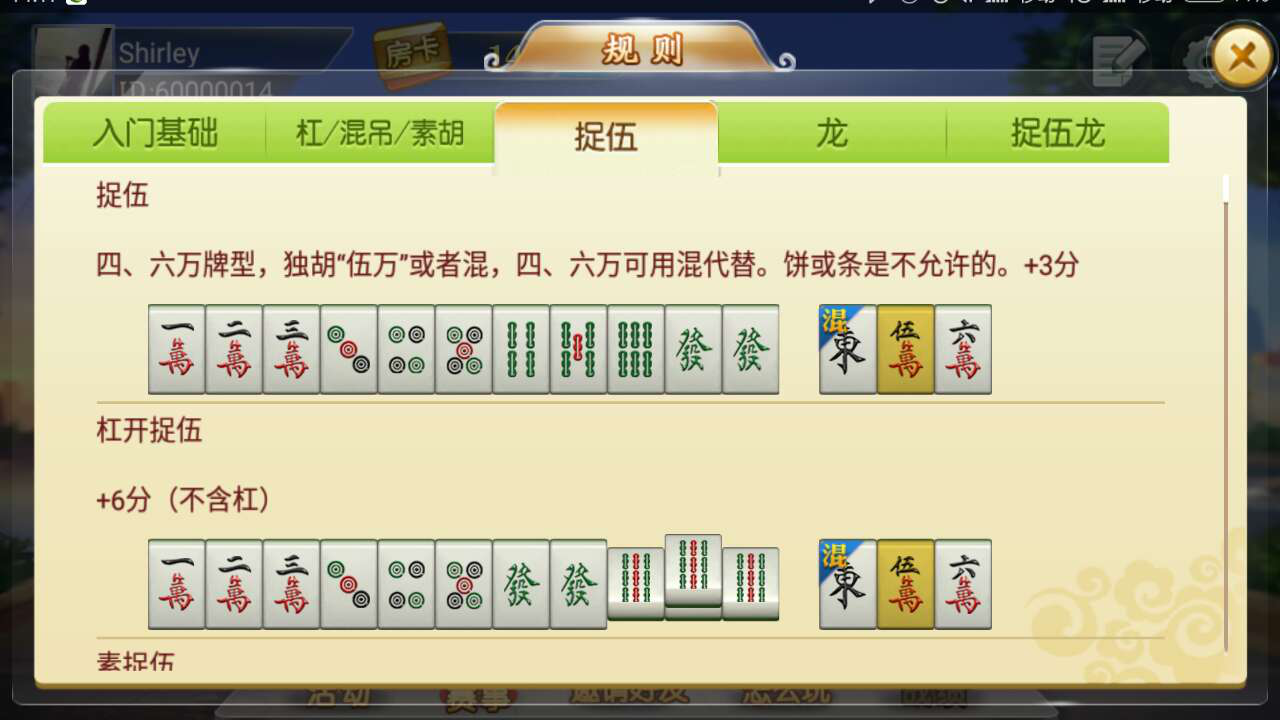 捉伍: 四、六万牌型,独胡“伍万”或者混,四、六万可用混代替。饼或条是不允许的。+3分