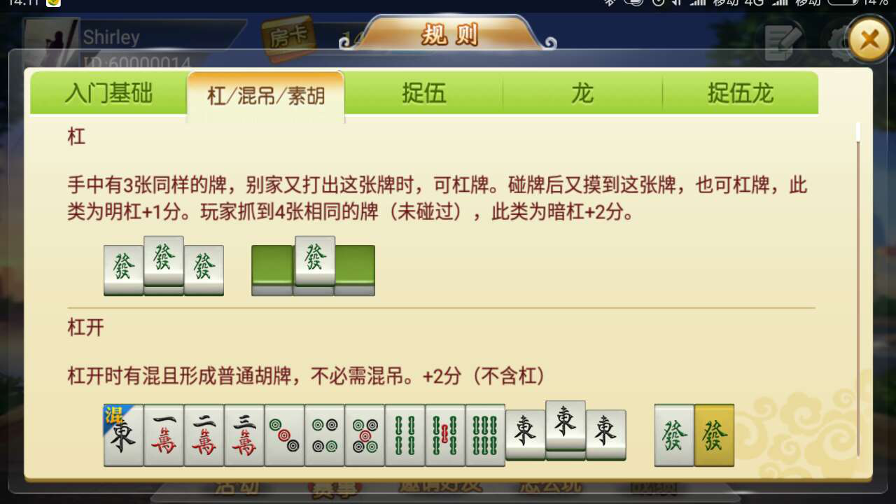 金杠: 抓到4张相同的混,称为金杠。开金杠时牌局结束,按混吊龙+8分。