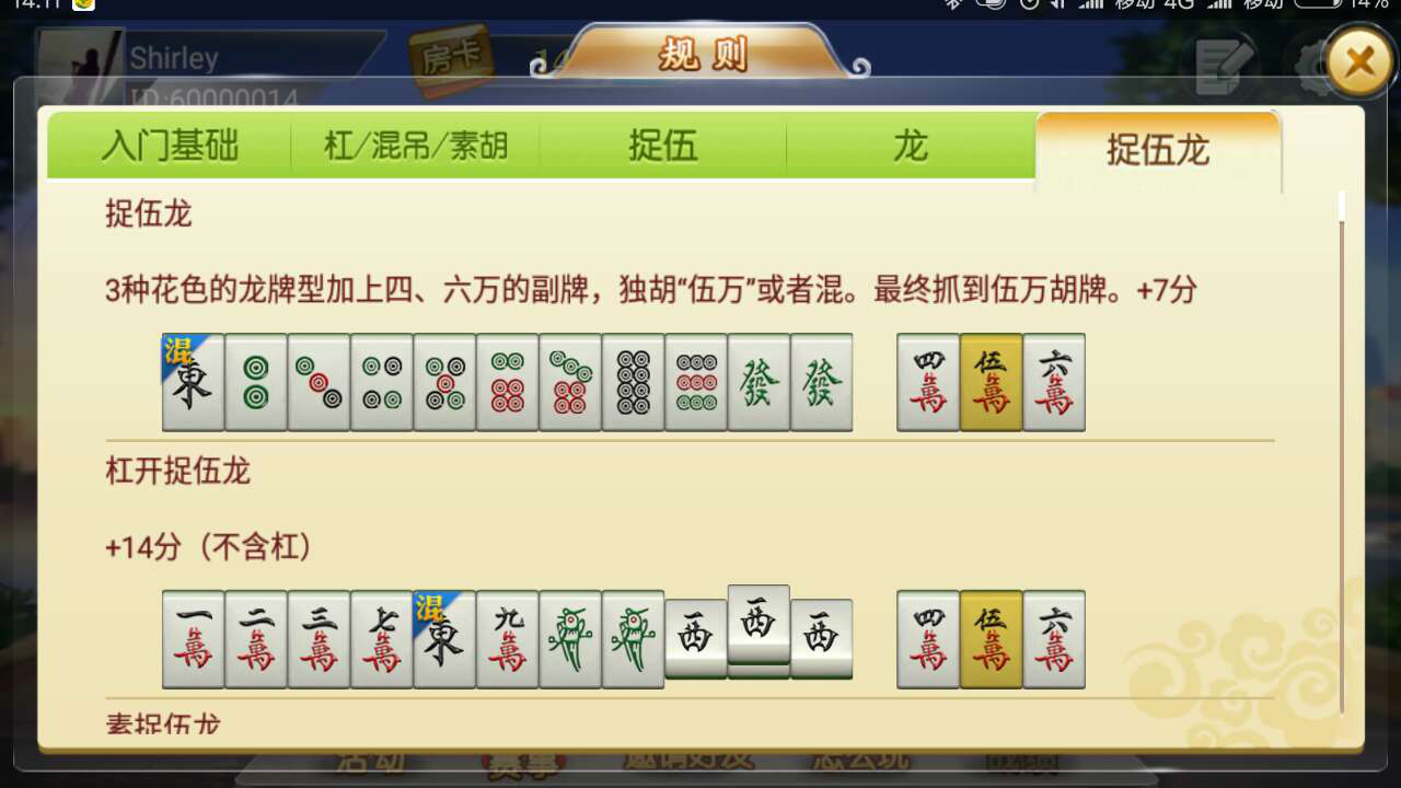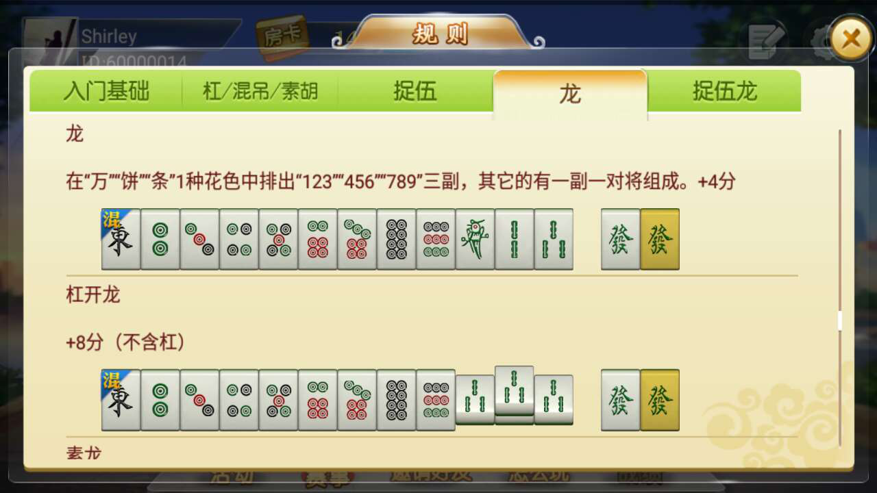 素本混龙: 可选规则,混与龙的花色一致且仅在龙1-9的牌型中,必须为2个不同的混。+16分