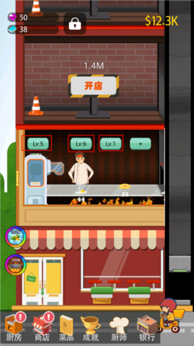 6、接着可以升级厨房可以获得更高收入解锁更新的菜品,升级工位可以大幅提高厨师的工作效率,升级出料机可以加快食材提供速度哦,这些都升级后,才能让出餐效率大大地提高,让店铺日进斗金!