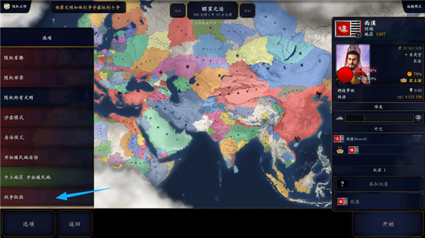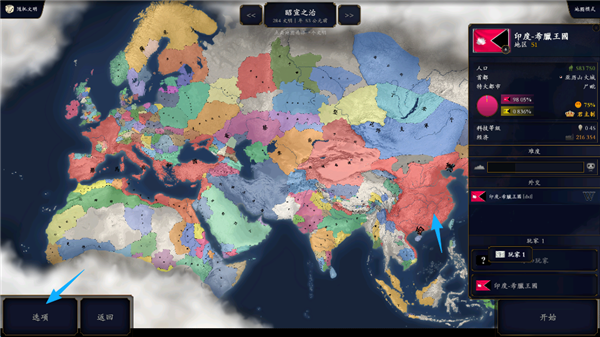 5、选择后,会随机选择一个国家作为玩家的操控国家级,如果我们需要自己选择游玩国家,可以再地图上自行点击该国家疆土,随后随手点开左下角的“选项”。