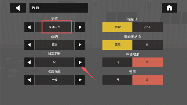 4、这样就完成了中文的设置,在手机性能的允许下,建议游玩时将“帧率限制”调高,可让操作更加流程。