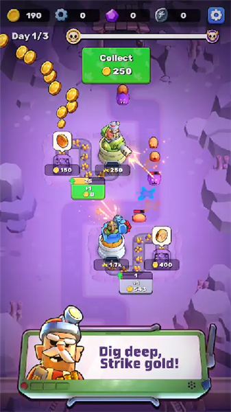 1.进入游戏后,先进行地下挖掘,派遣矮人开采黄金等资源,点击 “Collect” 收集初始资源,开启 “Dig deep, Strike gold!” 的挖矿进程。